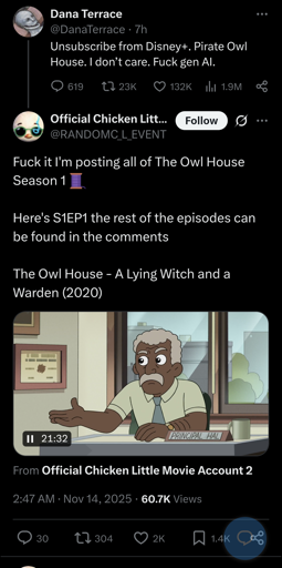 LiamBox@lemmy.ml to Piracy: ꜱᴀɪʟ ᴛʜᴇ ʜɪɢʜ ꜱᴇᴀꜱ@lemmy.dbzer0.comEnglish · 3 days ago'The Owl House’ creator Dana Terrace situation with Disney+ positive views on AI generated contentlemmy.mlimagemessage-square53linkfedilinkarrow-up1453arrow-down13