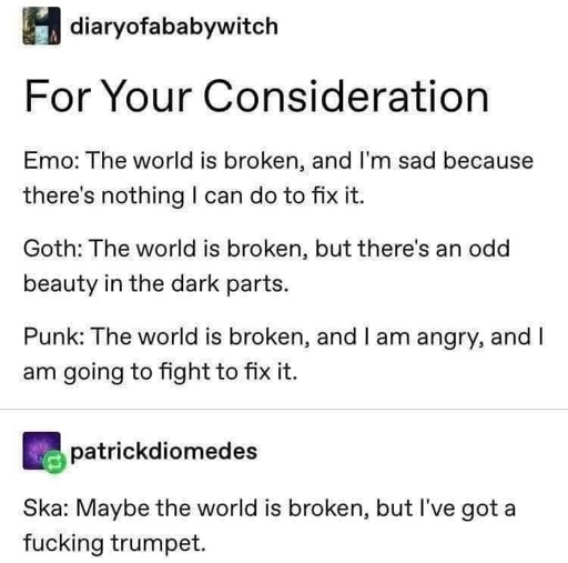 Yeah, after commenting that I considered that what some people consider goth is actually post-punk (the punk connection should be obvious), but then remembered goth rock exists obviously does not come from punk. Ska and emo though for sure, emo by ways of post-hardcore, by ways of hardcore, by ways of protopunk and you’ve already covered the ska lineage
