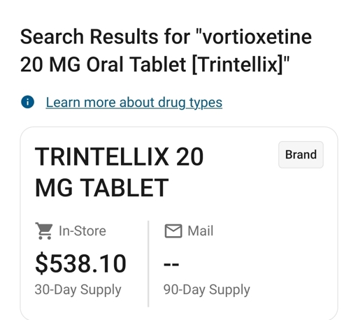@CatDogL0ver@lemmy.world yo I take the same stuff and was shocked at how much it is, but I found they have a discount card on the manufacturer website that brings it down to $10. https://us.trintellix.com/savings-support/savings-card