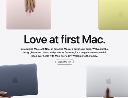 The laptop is built on an A18 Pro, a mobile chip first seen in the iPhone 16 Pro, which limits the machine to 8 GB of RAM. Storage comes in 256 or 512 GB, and whichever one you buy is the one you keep.